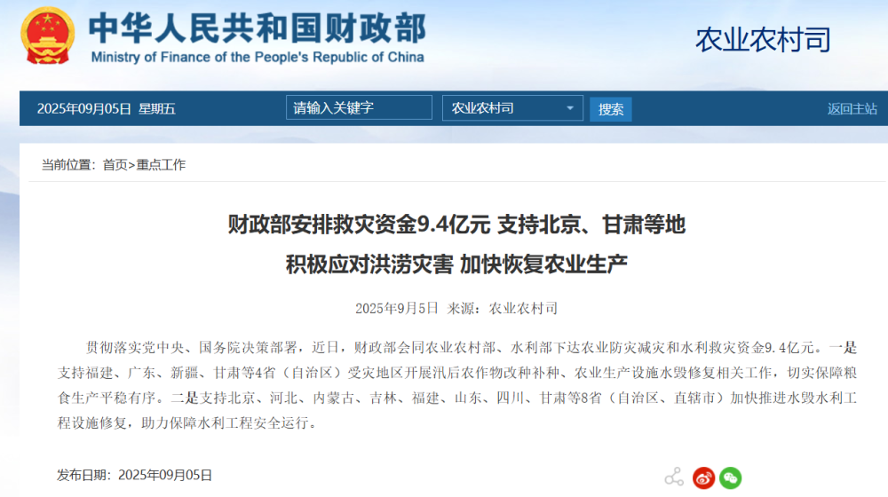 原标题:财政部安排救灾资金9.4亿元 支持北京、甘肃等地积极应对洪涝灾害 加快恢复农业生产