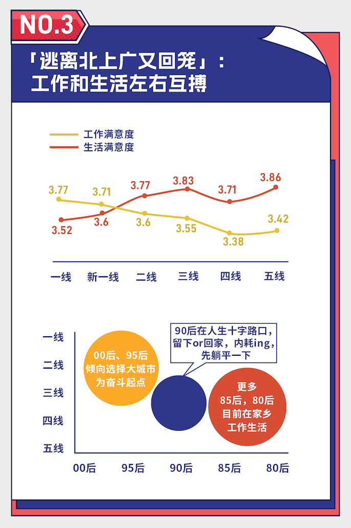 对于年轻人现状,调研显示“回笼漂”成新趋势,与低线城市工作满意度不足高相关。随着城市级别的提升,年轻人的工作满意度逐渐提升,而生活满意度逐步下降。更多00后、95后倾向于选择一线城市,作为奋斗的起点;更多80后目前在家乡发展;30岁左右的年轻人逐渐往家乡回流,有一部分选择成为“躺平青年”。