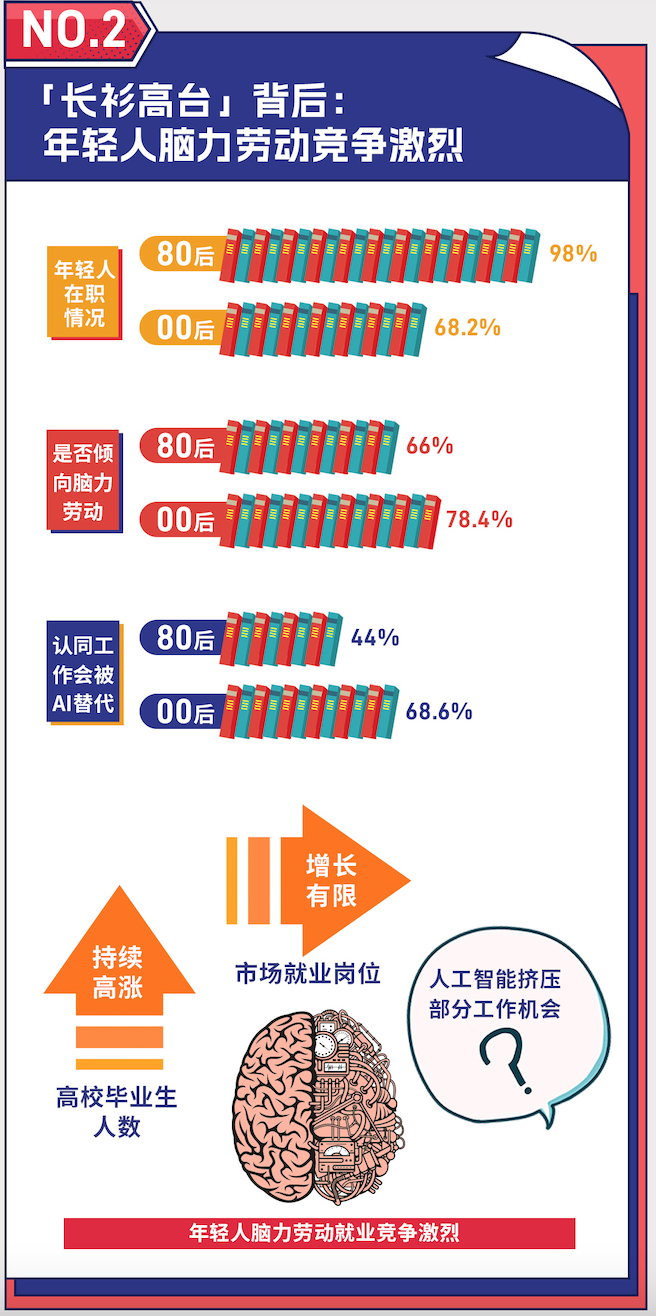 随机调研各年龄段的在职情况,相比80后98%在职,00后68.2%明显偏低。相比80后66%倾向从事脑力劳动,00后78.4%意愿更强。相比80后44%赞同工作会被人工智能替代,有68.6%的00后赞同此观点。