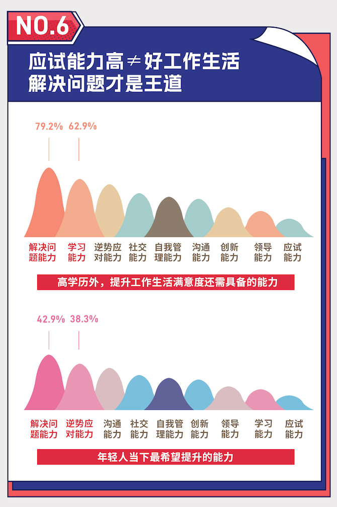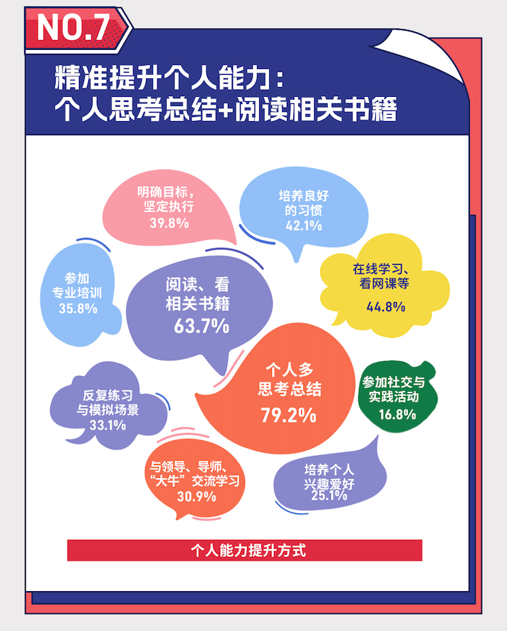 高学历之外,年轻人认为解决问题的能力、学习能力、逆势应对能力是帮助我们获得更好工作和生活的三大能力。解决问题的能力、逆势应对的能力也是当下年轻人最希望提升的。在五花八门的提升个人能力方式中,个人多思考总结以及阅读、看相关书籍,是年轻人提升个人能力最重要的手段。