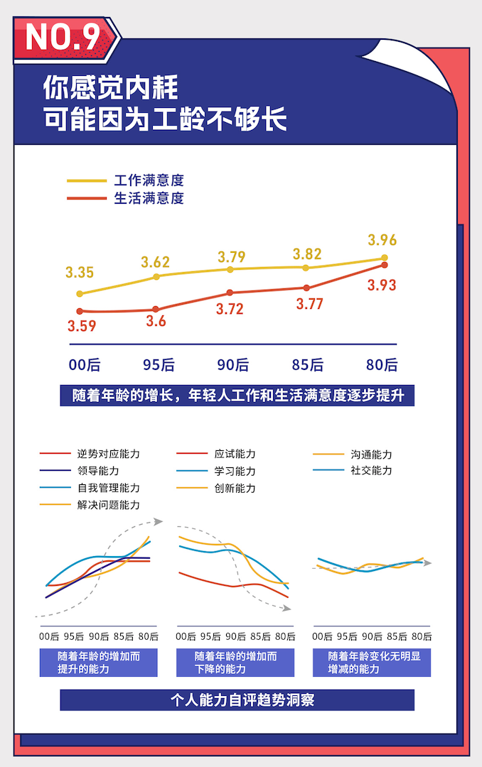 缺乏职业方向感是00后的普遍困惑;随着年龄的增长,“打工人”对职场的方向越来越明确;30岁左右的90后是心态情绪化最明显的时段;经过30岁这个坎,当工作和生活慢慢步入正轨,满意度逐步提升,年轻人的自我认同感会逐步增强。