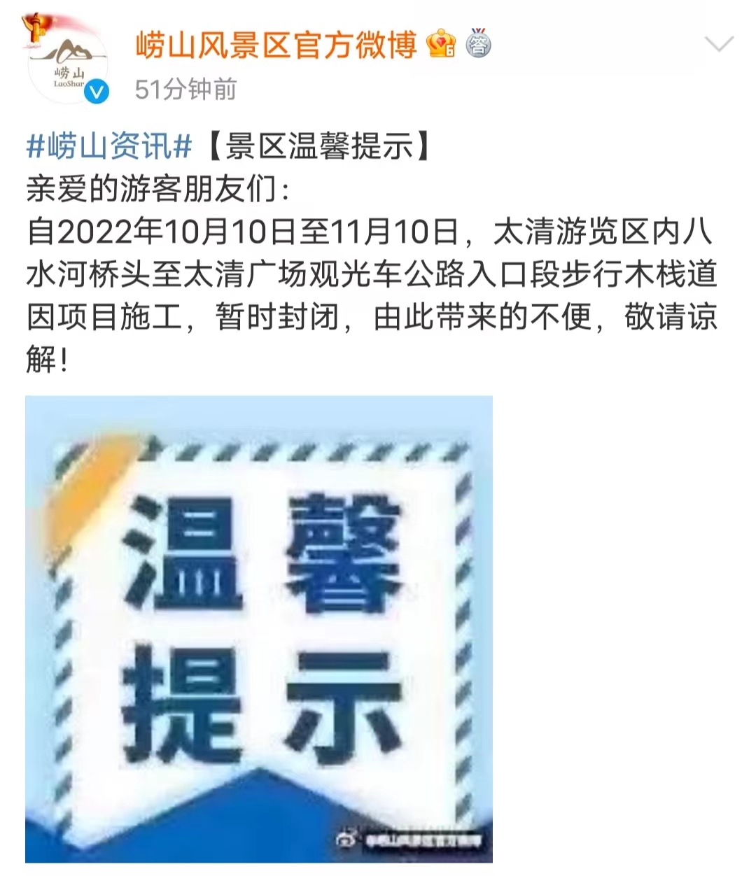 2022年10月10日至11月10日,太清游览区内八水河桥头至太清广场观光车公路入口段步行木栈道因项目施工,暂时封闭。(信网记者)