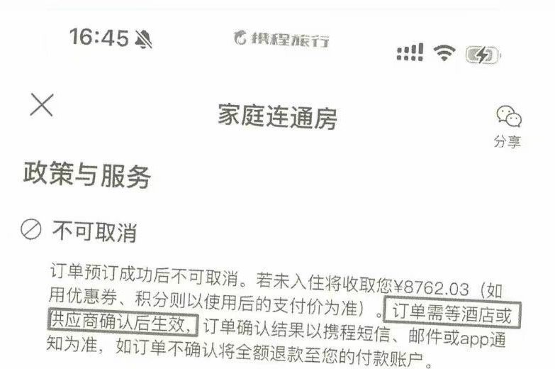 于女士还向信号新闻展示了这家酒店“家庭连通房”预订页面,其中的“政策与服务”中明确写道,“订单需等酒店或供应商确认后生效,订单确认结果以携程短信、邮件或App通知为准,如订单不确认将全额退款至您的付款账户。”于女士认为,自己取消预订在前,收到邮件在后,按照上述“规则”,自己操作取消时,这个订单并未实际确认。