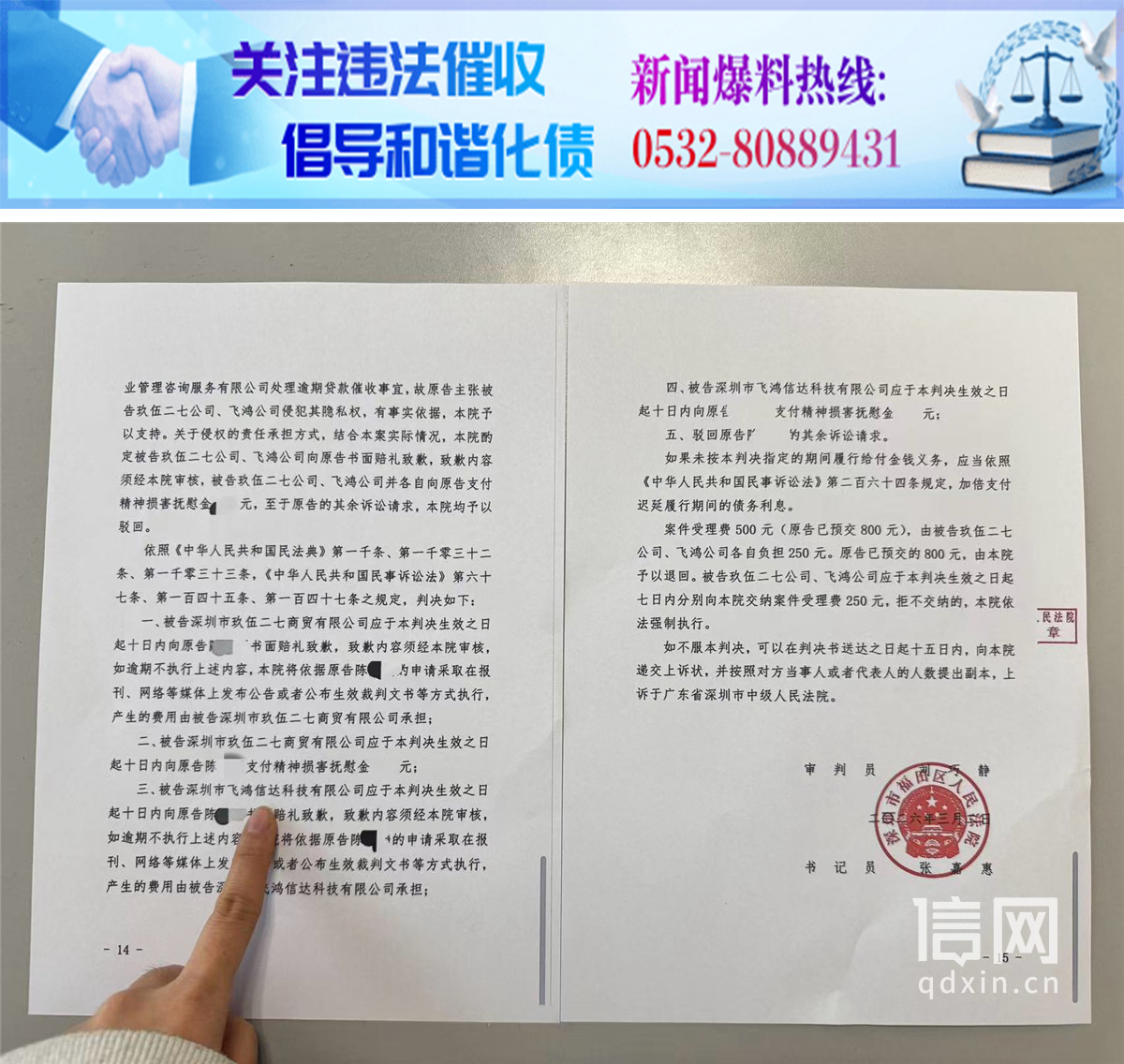 信网·信号新闻4月23日讯 江西的陈女士有多笔网贷逾期,催收短信发给了她弟弟与同事。短信以“利信金融”的名义,隐匿了催收方、放款方信息,陈女士只能将发送短信的两家公司诉至法院。信号新闻(0532-80889431)了解到,近日,深圳市福田区人民法院判决深圳市玖伍二七商贸有限公司(以下简称“玖伍二七”)与深圳市飞鸿信达科技有限公司(以下简称“飞鸿信达”)向陈女士赔礼道歉,并支付一定的精神损害抚慰金。从两家公司提供的证据看,剥开层层“马甲”后,源头指向了四川裕秦企业管理咨询服务有限公司(以下简称“四川裕秦”),该司已在今年2月注销,真实催收方无法查明。