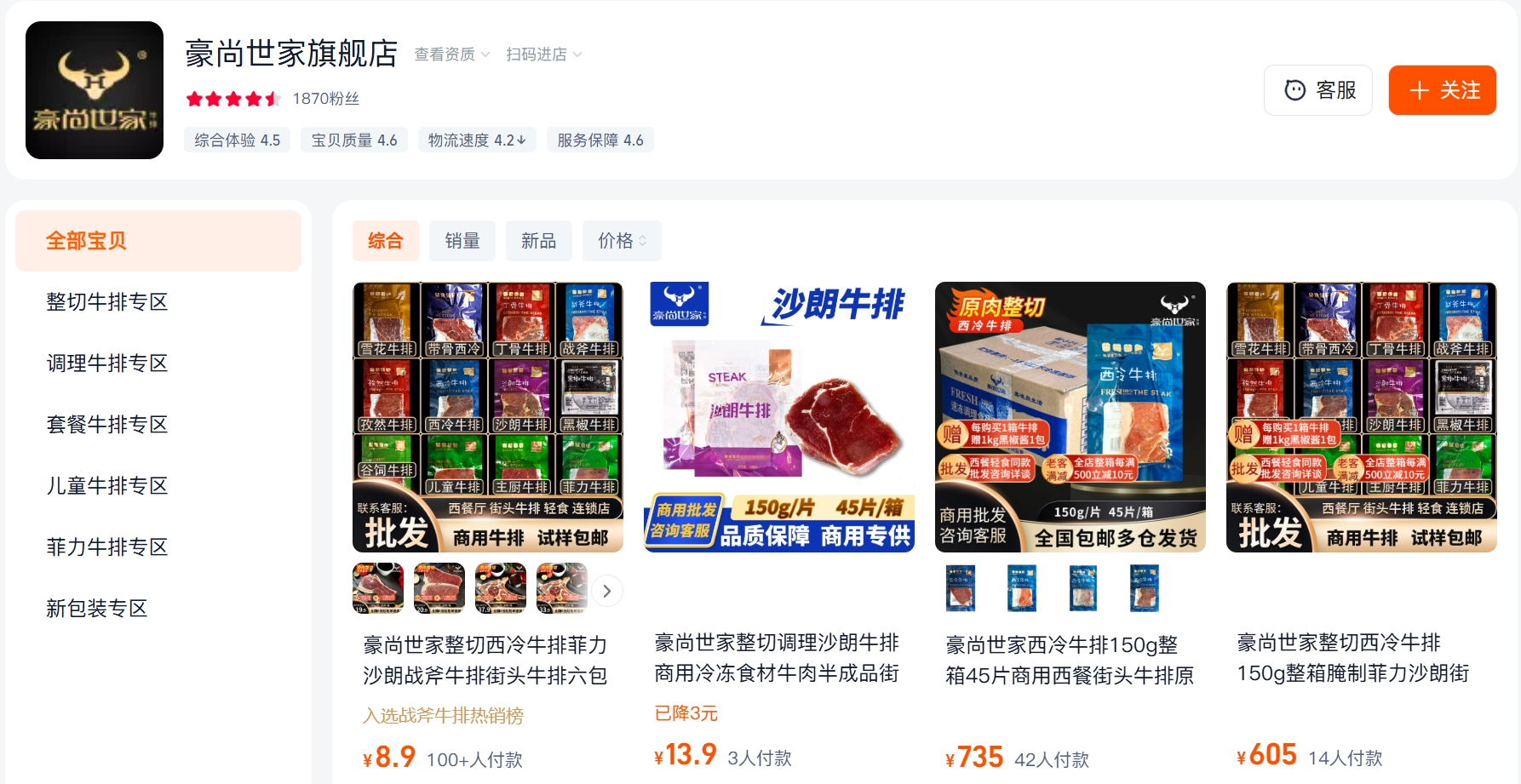 企查查平台信息显示,福建豪尚世家食品有限公司成立于2012年8月30日,注册资本500万元,法定代表人夏小铃,经营范围包括速冻食品(速冻肉制品)生产;速冻食品批发、代购代销。该公司在天猫平台经营“豪尚世家旗舰店”,店内销售各类牛排产品。(信网记者)