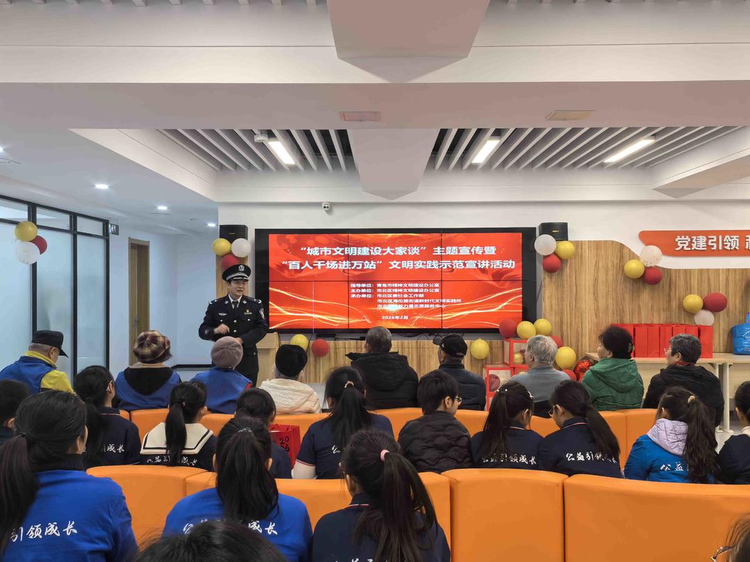 信网2月6日讯 在城市文明建设的壮阔征程中,每一份温暖的坚守都值得铭记,每一个平凡的身影都闪耀光芒。2月6日,一场饱含温度的青岛市“城市文明建设大家谈”主题宣传暨“百人千场进万站”文明实践示范宣讲活动,在市北区海伦路街道安达路社区文化书院举行。活动以“榜样领航传文明,初心如磐践使命”为导向,依托沉浸式分享与走心交流,让城市文明的理念在鲜活具体的故事中直抵人心、落地生根。